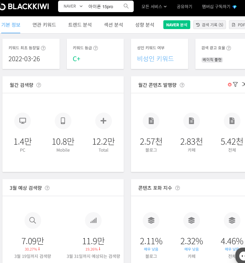 먼저 블랙키위에서는 무료와 유료로 분리하여 서비스를 제공하고 있습니다. 저의 경우는 무료만으로도 충분한 정보를 획득하고 있습니다. 네이버에서 그 키워드가 얼마나 검색되고 어느 정도의 글이 있는지를 검색을 통해 알 수 있습니다.