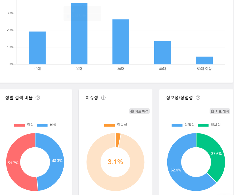 블랙키위의 유용성은 지금 이슈가 되는 키워드를 추천해주는 기능과 영향력 순위, 검색 결과의 도출까지 걸리는 시간, 키워드 등급을 알 수 있다는 점입니다. 또한 키워드 검색량 뿐만 아니라 그 키워드를 검색하는 성별의 비율과 나이대를 알 수 있습니다. 이는 특성 키워드를 노출시키기 위한 타케팅을 하는 것에 유용합니다.